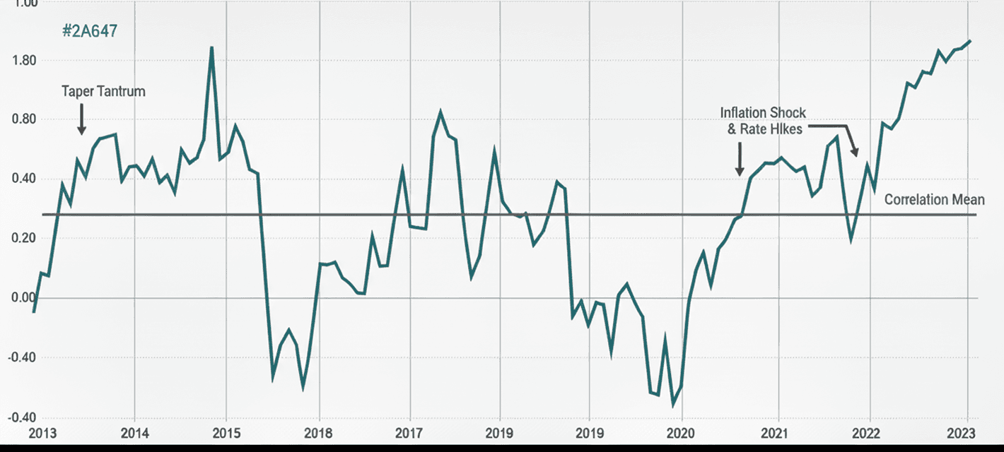 Source: LSEG. Chart shows the correlation of returns between FTSE Global All-World Index and FTSE World Government Bond Index.